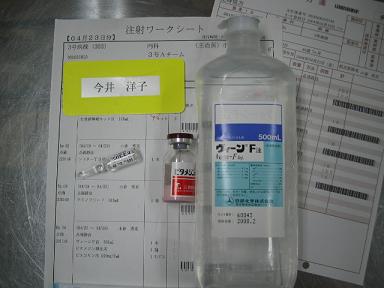 ナースステーションの一角。作業台の上には、点滴と注射のための薬剤が置いてある。その脇に、看護師の名前が書かれた黄色のカードが添えられている。
