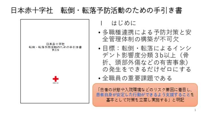2018年、本部の医療安全対策部会が転倒転落ワーキンググループを立ち上げ、2019年に「転倒・転落予防の手引き」を作成し、全グループ病院施設に配布。2020年8月に第2版に改訂した。手引きでは転倒転落予防活動に関する基本的な考え方と、組織的に転倒・転落予防活動に取り組むことを示している。特に多職種による予防対策と安全管理体制の構築が不可欠であるということ、目標としては「インシデントレベル、影響度分類の3以上(骨折や頭部外傷などの有害事象になるような大きな障害)の発生をゼロに近づける」ことを明示した。