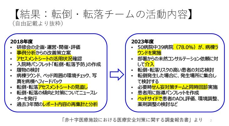 手引き発行から5年後に評価のため実態調査をしたところ、転倒転落チームがある施設は手引き書発行前の2018年時点の31施設(34%)から、2023年度には50施設(53.2%)に増加していた。転倒転落チームへの医師の参加 は、25施設から36施設になっていた。転倒転落チームがある施設の増加に比べ、医師が参加する施設はあまり増えていなかった。