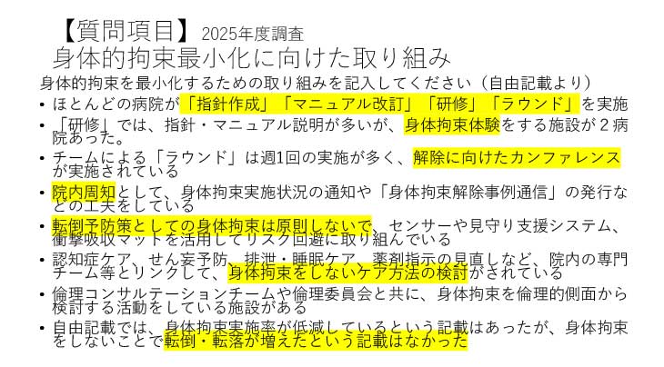 座長:厚労省の調査評価委員会によると、急性期から慢性期までは身体的拘束は12%未満で、回復期療養に関しては平均的には10%以下、病院によっては20%以上30%と様々だ。身体拘束を減らすのは難しいが、病院の規模によっても異なるのか。