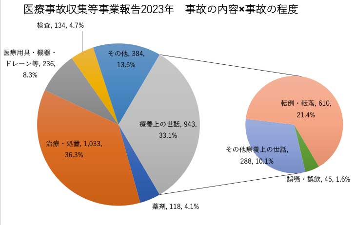 厚生労働省人口動態統計の不慮の事故による死因の経年的変化を見ると、1995年には不慮の事故の死因の中で転倒転落事故死は第3位13%、交通事故による死亡は33.4%だった。その25年後、交通事故は3分の1以下に減少したが、転倒転落事故の割合は2倍以上に増えた。医療事故による死亡または障害が残る可能性がある事故を場面別に分類したグラフでは、療養上の世話における事故は943件と、治療や処置の1033件に次いで2番目だが、これをさらに分類をすると、転倒転落が最も多く610件を占めている。